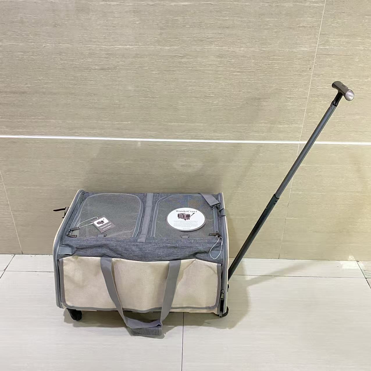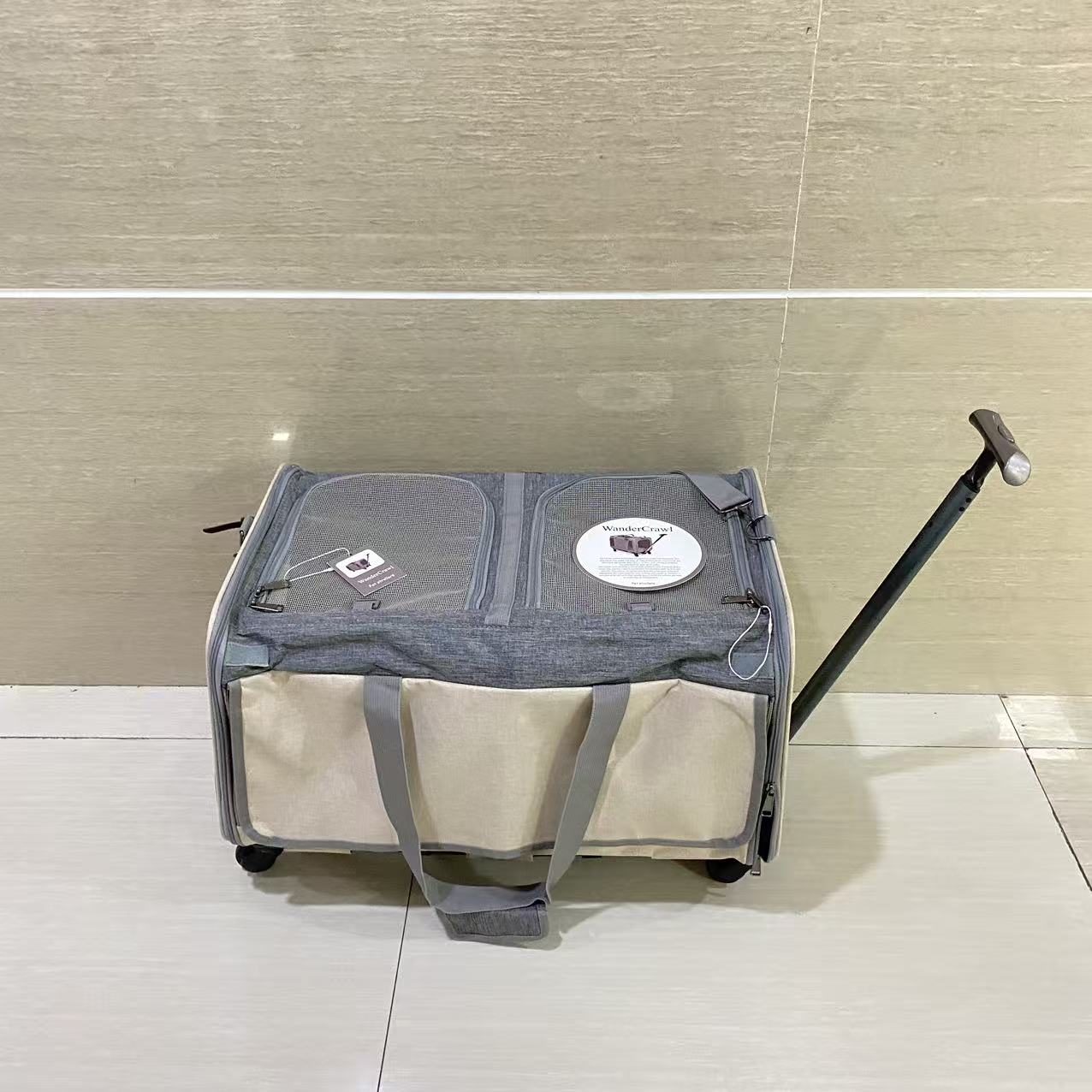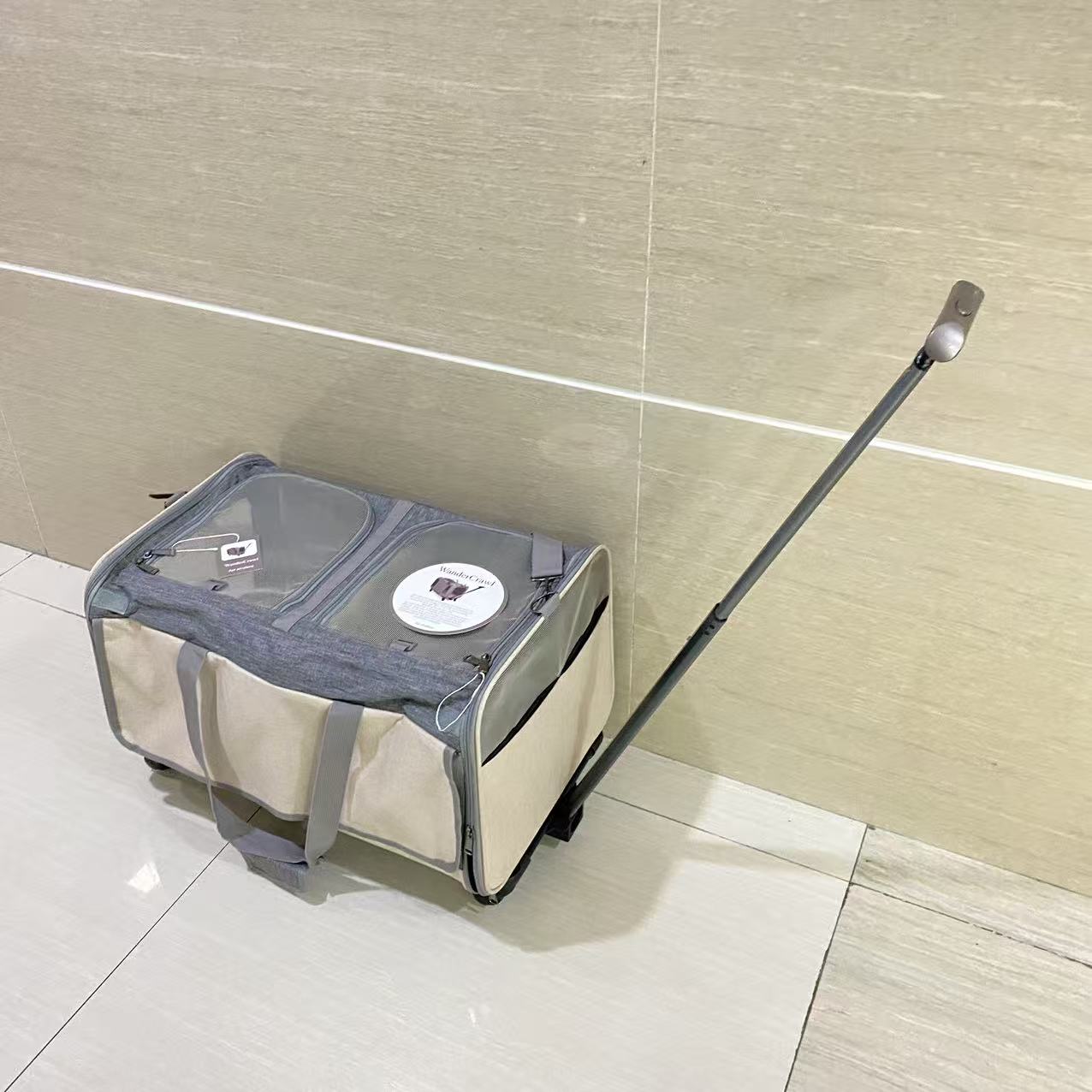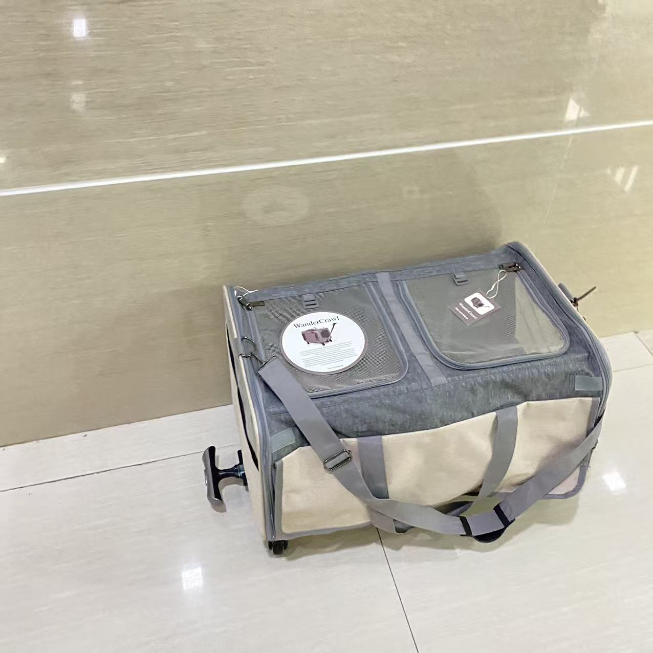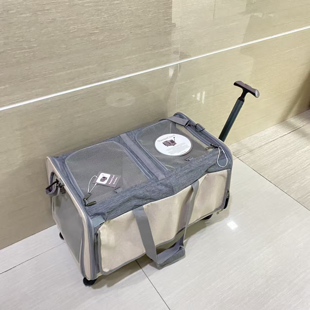 Pet Carrier with Wheels: A removable platform with 4 wheels and a telescopic handle make it convenient for travelers walking through airports. The rolling cat carrier also features a carrying strap and adjustable shoulder strap for easy pulling and pushing. Platform is securely attached with high grade velcro while the wheels are easy to assemble or disassemble.