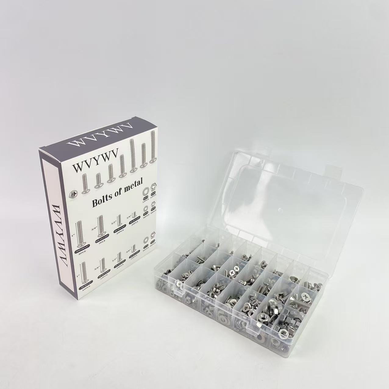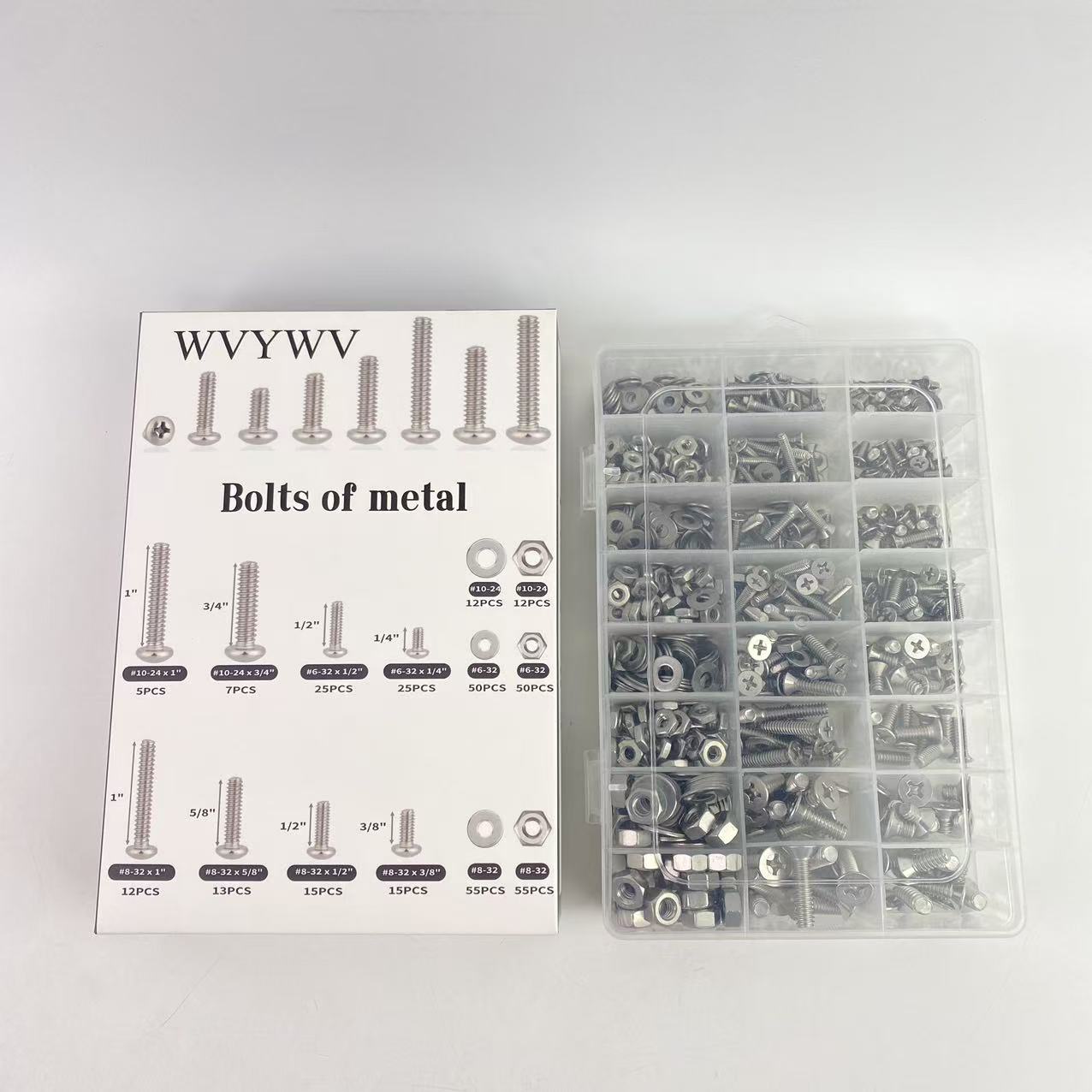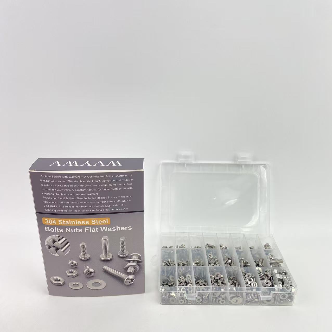 Phillips Pan Head & Multi Sizes:Including 351pcs 8 sizes of the most commonly used nuts bolts and washers for your choice, #6-32, #8-32,#10-24, SAE Phillips Pan head machine screw,provide 1:1:1 matching combination, each screw matching a nut and a washer.